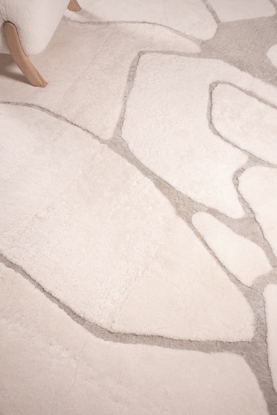 GLIMPSE is a poetic interplay of pure whites and warm grays, designed to feel like a quiet conversation in wool. With sculptural lines that echo organic movement, each shape is hand-cut to reveal a flowing map of soft sheepskin texture.