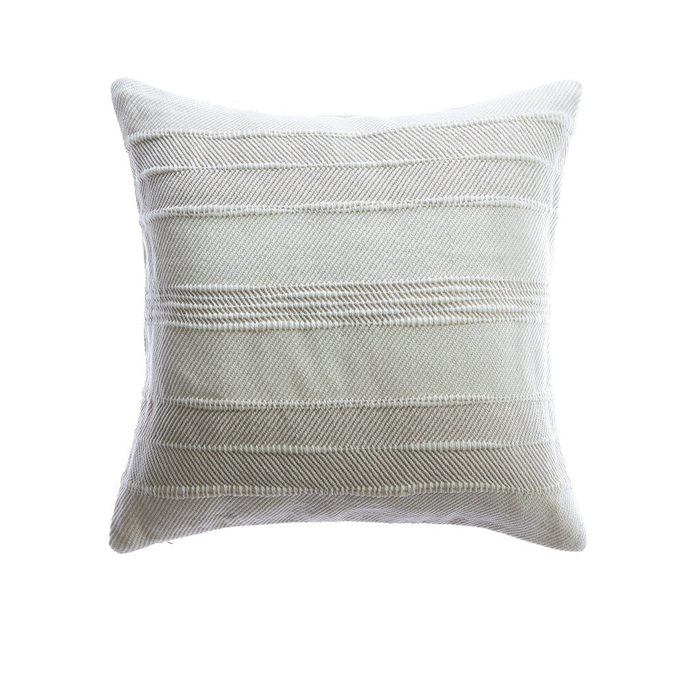 Decorative handwoven pillow with ivory & beige wool woven herringbone accents. Backed with a plain natural ivory woven fabric of the same material and finished with a hidden zipper closure.
